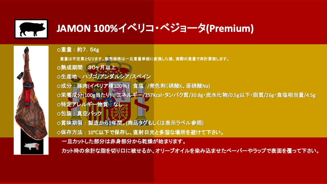 | 1 | JAMON 100%イベリコ・ベジョータ(Premium) | ¥103,500.- (7.5Kg) | 無料 | △ | |