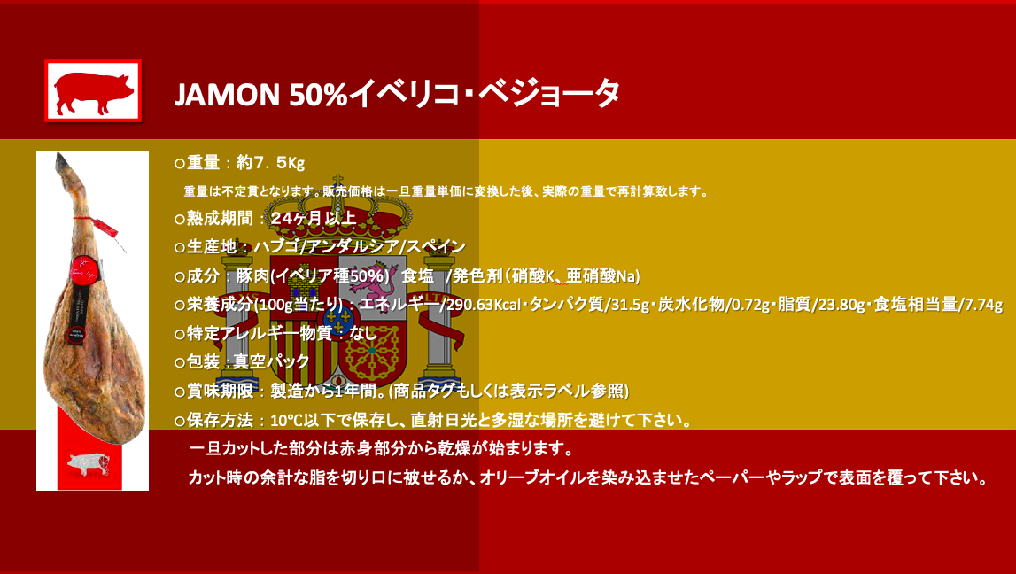| 3 | JAMON 50%イベリコ・ベジョータ | ¥99,400.- (7.5Kg) | × | ||