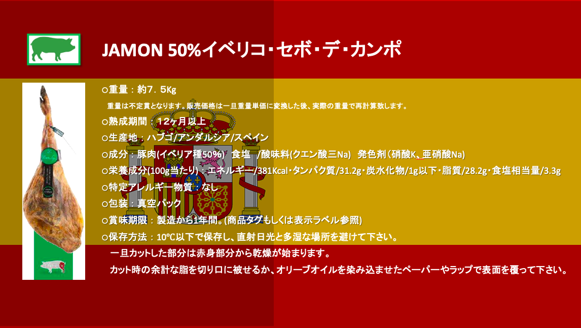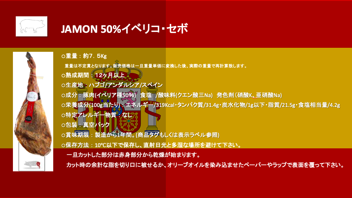 | 5 | JAMON 50%イベリコ・セボ・デ・カンポ | ¥84,600.- (7.5Kg) | ○ | ||