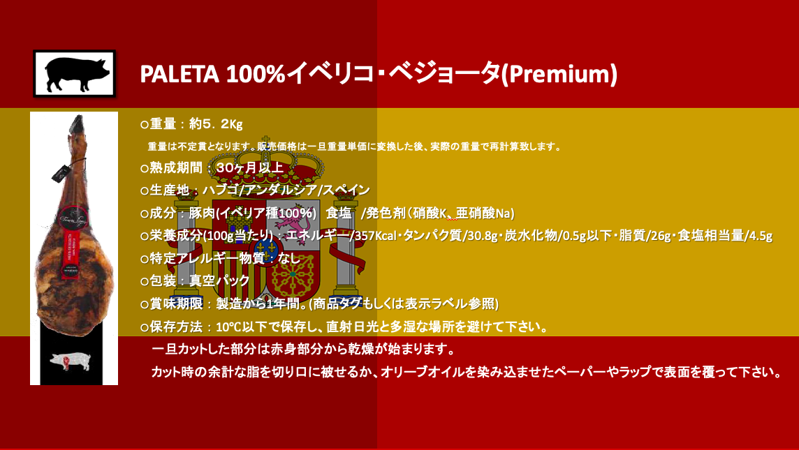 | 2 | PALETA 100%イベリコ・ベジョータ(Premium) | ¥53,500.- (5.2Kg) | ○ | ||