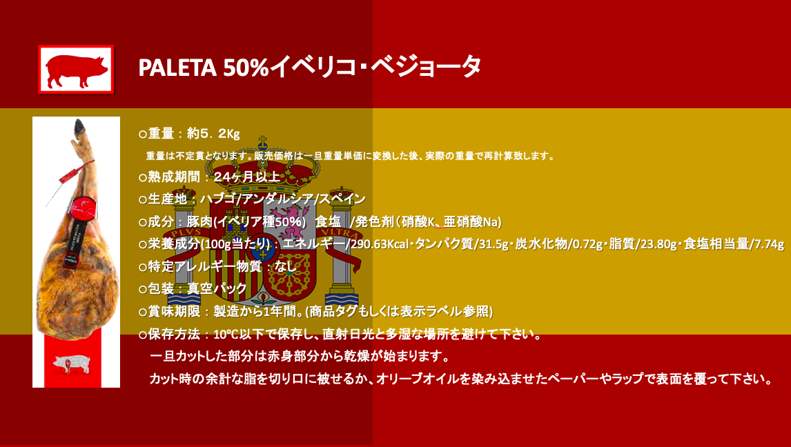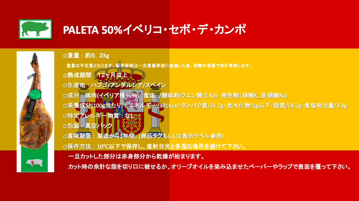 | 4 | PALETA 50%イベリコ・ベジョータ | ¥51,800.- (5.2Kg) | × | ||