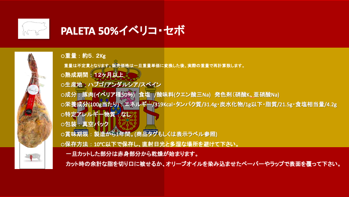 | 6 | PALETA 50%イベリコ・セボ・デ・カンポ | ¥50,600.- (5.2Kg) | × | ||